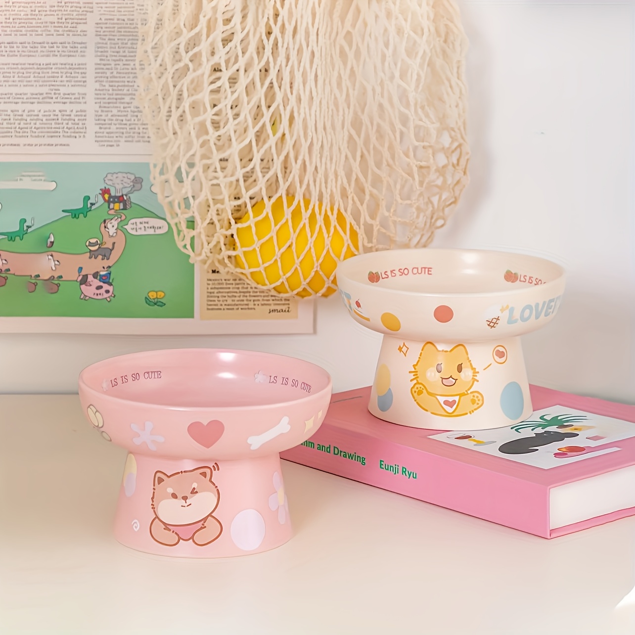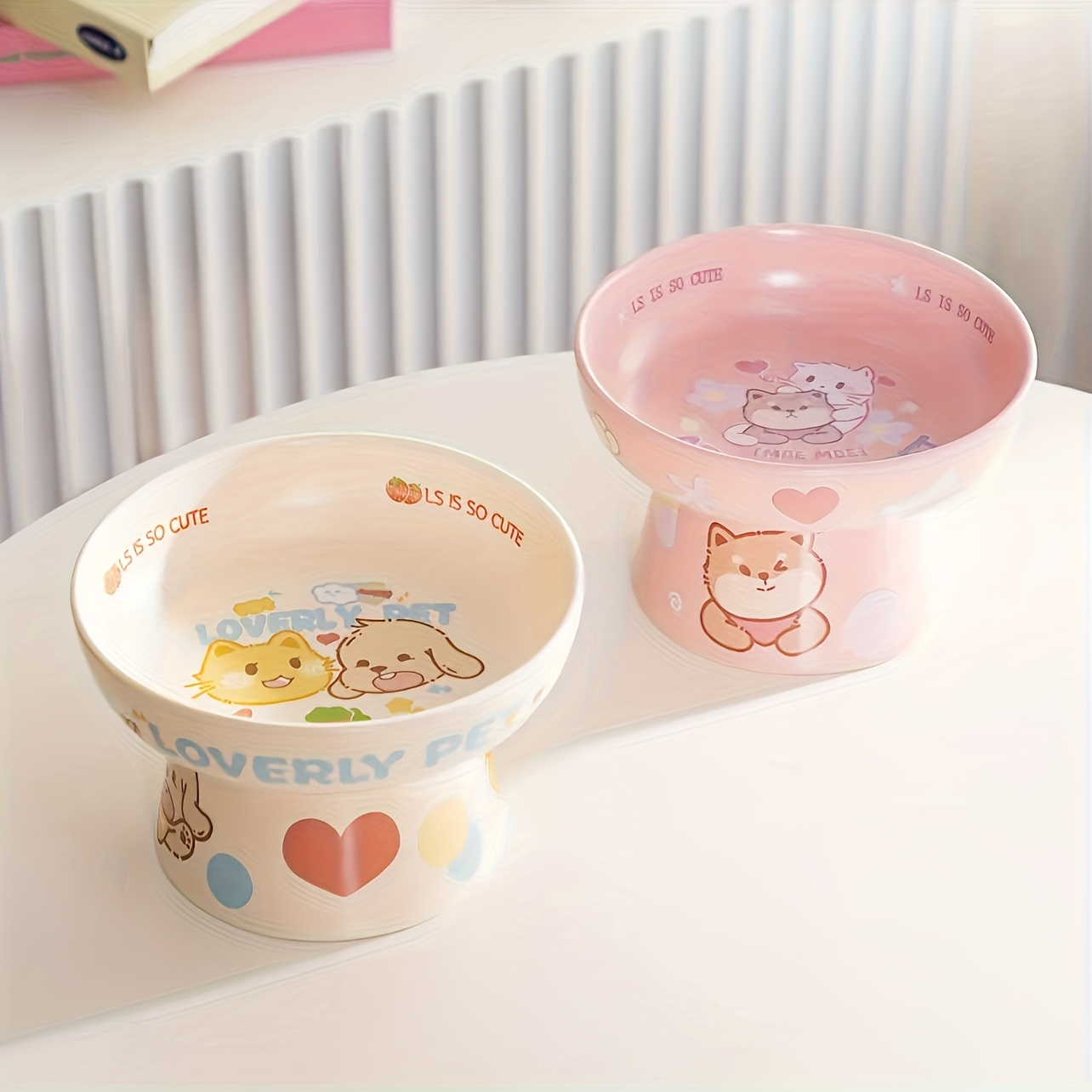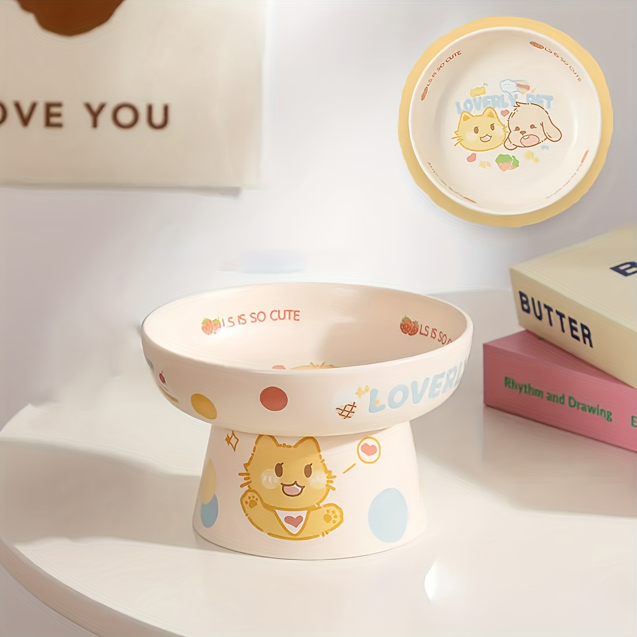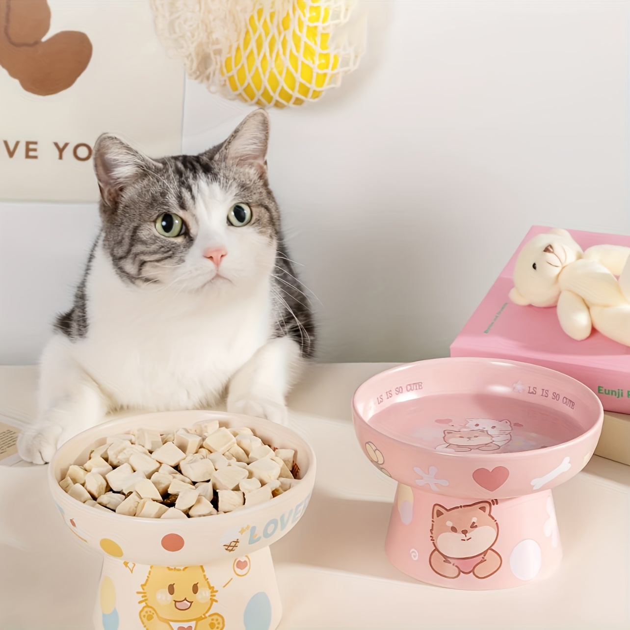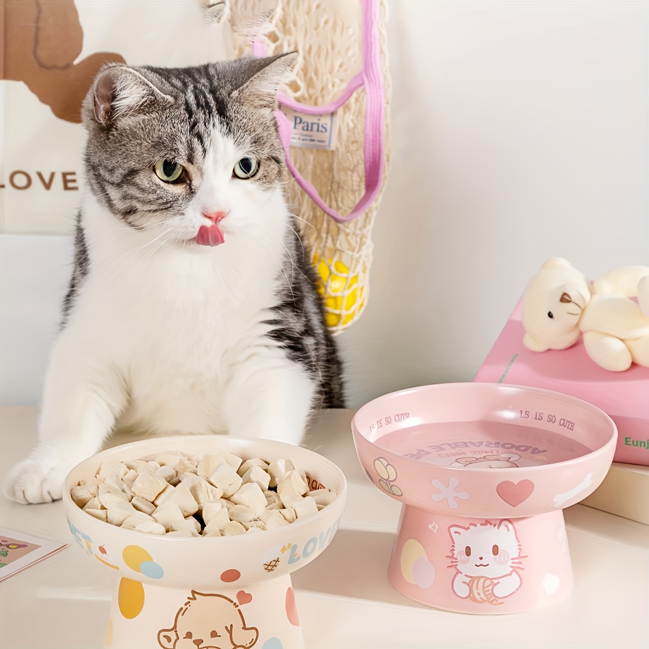 Ceramic Heightened for cat Bowl | Cute Cartoon Design, Neck-friendly, Non-slip, Perfect for Cats and Puppies, Prevents Black Beard and Spills