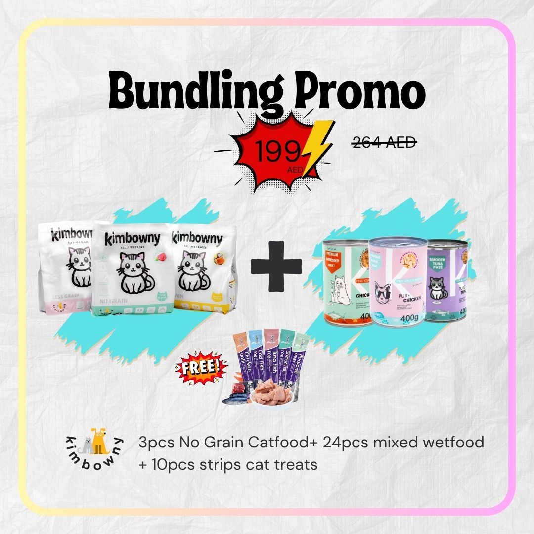 Save big with our ultimate cat bundle for only AED 199 (was AED 264). Enjoy 3 packs of Kimbowny No Grain Cat Food, 24pcs assorted wet food, plus 10pcs strips cat treats for free. Full meals, tasty variety, and fun treats all in one unbeatable deal.